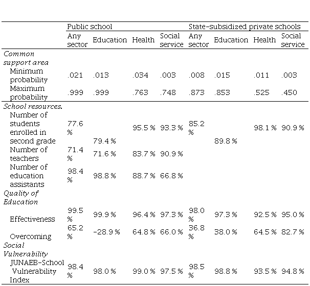 The score function to balance propensity scores in participating and non-participating schools was used. This function divides the propensity scores into quintiles and evaluates, for each one, the differences between the participating and non-participating groups, concerning predictors (i. e., significative predictors of school performance regression model). The covariates included allowed for an optimal matched without the need for an additional procedure. In the comparisons, the common support zone included 100 % of the cases, except for public schools that collaborated with the Health sector (97 %) and Social Services sector (98.5 %).