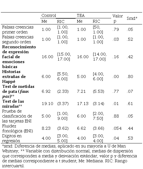 La Tabla 1 contiene el valor medio y la desviación estándar (DE), así como la mediana y rango intercuartil (RI) del puntaje obtenido por los participantes de cada grupo en cada una de las pruebas. Asimismo, muestra la diferencia de medias estandarizadas entre los grupos y, por último, la comparación del puntaje medio.
