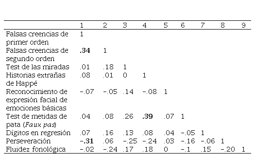 Para la evaluación de la cognición social se utilizaron: (1) el test de falsas creencias de primer y segundo orden (Baron-Cohen, Leslie y Frith, 1985 y 1989) para evaluar la habilidad de sujetos para inferir que alguien tiene una creencia que es distinta de la propia y de un tercero; (2) el test de expresiones faciales, adaptado por Paul Ekman para valorar el reconocimiento emocional facial; y (3) los test avanzados como Historias extrañas de Happé (Happé, 1994 adaptado por Roqueta, 2009); el test de metidas de pata –faux pas–(Baron-Cohen, Jolliffe, Mortimore y Robertson, 1997), y el test de la mirada para niños, que sirven para evaluar la comprensión del lenguaje encubierto, la detección de mentiras o engaño y la atribución de emociones cognitivas mediante la inferencia de las creencias o intenciones de otros.