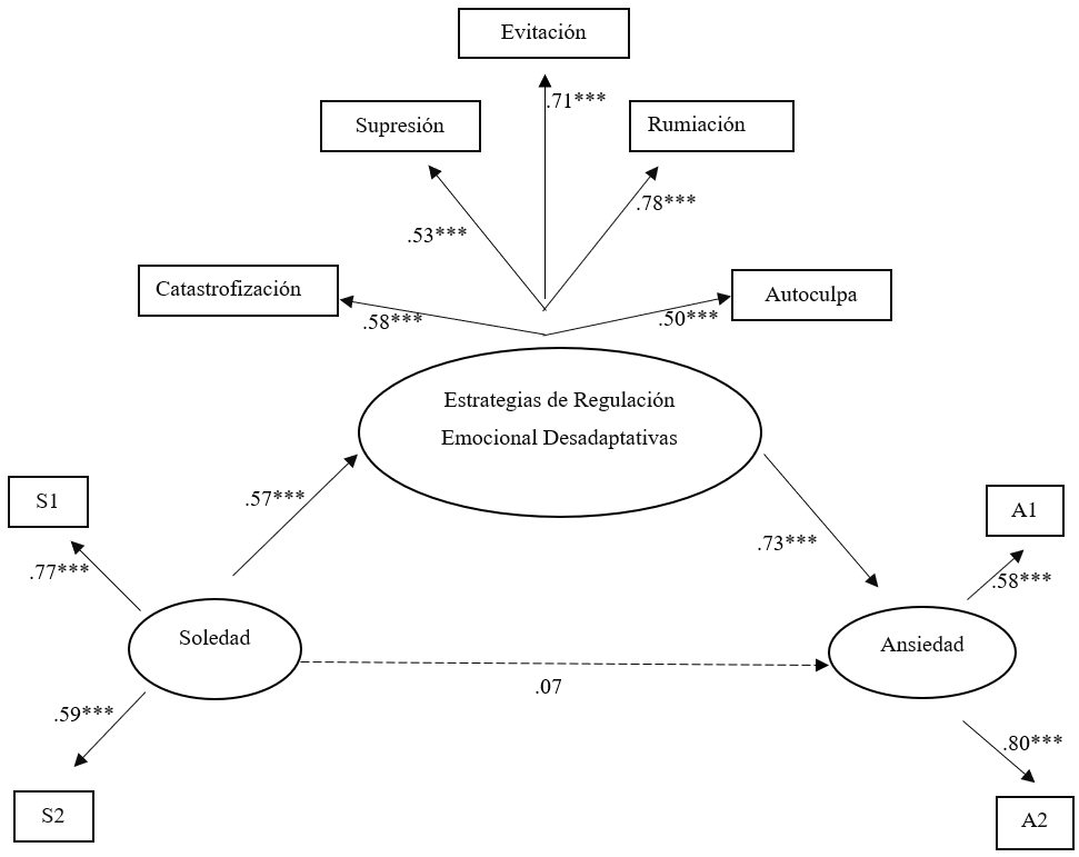 Nota: Modelo de ecuación estructural que muestra las relaciones entre soledad, estrategias de regulación emocional desadaptativas y ansiedad. Los valores son los coeficientes estandarizados. *** p < .001.