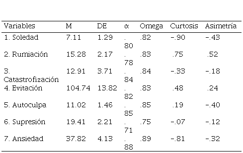 En un primer momento se calculó la media, desviación estándar, los valores de curtosis y asimetría, el alfa de Cronbach, así como las correlaciones bivariadas entre todas las variables de estudio (véase Tabla 1). Las correlaciones entre la soledad, las estrategias de regulación y la ansiedad que presentaron las magnitudes más elevadas se muestran resaltadas en esta primera tabla.