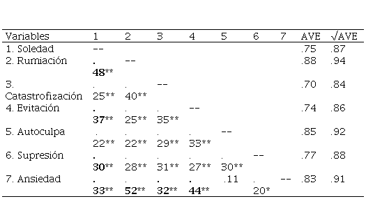 In order to carry out the mediating analysis, a structural equation model was created which included three latent variables (loneliness, maladaptive emotion regulation strategies and anxiety). This model was tested using the Lavaan software. The indirect effects were analyzed using the bootstrapping method. The results showed that maladaptive emotional regulation strategies had a mediating role which was positive and significant in the relation between loneliness and anxiety. Regarding the measurement model, confirmatory factor analysis was used to test the measurement model comprising the three latent variables. Results showed that the measurement model fit the observed data appropriately. Furthermore, with the purpose of examining the validity of the measurement model, the average variance extracted and square root of the average variance extracted were calculated. Findings indicated that the average variance extracted for each construct was higher than all the squared correlations involving that construct. This confirmed the discriminant validity of all variables of study.