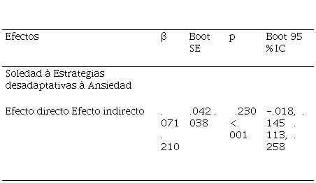 De esta manera, los resultados mostraron que la soledad estuvo relacionada positivamente con las estrategias de regulación emocional desadaptativas (β = .57, SE = .08, p < .001). Asimismo, las estrategias de regulación emocional desadaptativas estuvieron asociadas positivamente con la ansiedad (β = .73, SE = .10, p < .001). A su vez, se pudo confirmar la principal hipótesis de esta investigación, la cual postulaba que las estrategias de regulación emocional desadaptativas mediarían el impacto de la soledad en la ansiedad que experimentaban los estudiantes universitarios (β = .21, SE = .04, p < .001). El hecho de añadir más trayectorias al modelo o el eliminar variables observadas no mejoró el ajuste del modelo estructural. Por otra parte, también se confirmó la segunda hipótesis que establecía que la soledad tendría un efecto directo no significativo en la ansiedad (β = .07, SE = .04, p = .23; Figura 1). Con respecto al análisis de mediación y los efectos indirectos, estos se llevaron a cabo con 10 000 muestras bootstrap, lo que generó 95 % de intervalos de confianza corregidos por sesgo para los efectos indirectos. Con el propósito de incrementar la potencia del modelo y estimar los efectos directos, Hayes y Preacher (2010) sugieren usar la técnica de bootstrapping, por medio de la cual se obtienen los límites de confianza para los efectos indirectos. Como el método bootstrapping es el más efectivo para analizar los efectos indirectos, estos resultan estadísticamente significativos si los intervalos no incluyen el cero. Los resultados del análisis de mediación y los efectos indirectos para la ansiedad, así como sus predictores y variables mediadoras, se muestran en la Tabla 3.