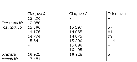 En la Figura 1 se observa que, a partir de las líneas verticales, S inicia el claqueo y luego se incorpora C. En la Tabla 1 se presentan los valores temporales, medidos en ms, de los ataques fuertes de la presentación y la primera repetición del motivo de claqueo de S y los ataques del claqueo de C, correspondientes al mismo fragmento de la pista sonora visualizado en la Figura 1. En la columna derecha se muestra la diferencia, también medida en ms, entre los ataques del claqueo de S y C; se puede observar que el grado de sincronía interactiva a partir de un pulso subyacente entre el claqueo de S y de C ronda un nivel inferior o aproximado a los 125 ms.