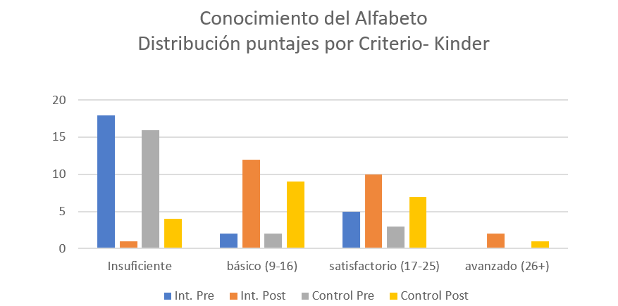 En la Figura 1 es posible observar la distribución de puntajes por categorías en cada uno de los grupos y para pre y postests. Como ya se ha mencionado, dado que no hay criterios para la evaluación del conocimiento del alfabeto en prekindergarten no se utilizaron los criterios para su análisis, sino que se considera que el avance de 3.14 a 8.4 letras identificadas por el grupo de intervención constituye un avance importante que deja a estos estudiantes mejor preparados para consolidar su conocimiento del alfabeto al finalizar el curso de kindergarten.