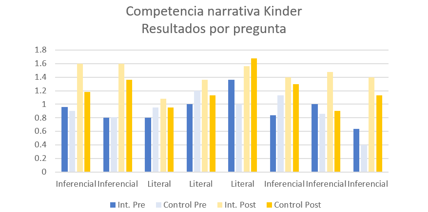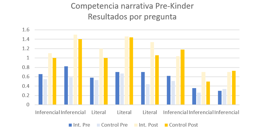 Los alumnos de kindergarten son también quienes obtienen mayores ganancias en competencia narrativa, pues incrementan su puntaje en 4.1 puntos, versus los estudiantes del grupo control que mejoran en apenas 2.2 puntos. En prekinder, en cambio, el incremento es mayor para el grupo control: 4.8 vs. 4.4 puntos del grupo de intervención.
