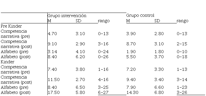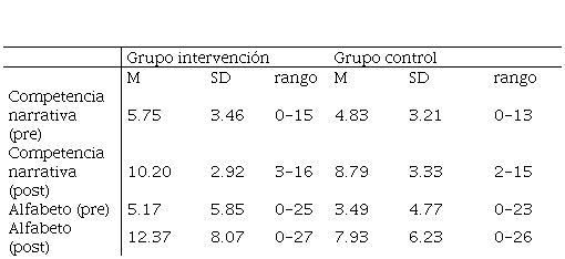 Si bien el grupo control tiene un resultado inferior al grupo de intervención en los pretest, tanto de competencia narrativa como de conocimiento del alfabeto, los análisis de varianza reflejaron que no existen diferencias significativas entre ambos grupos: F(1,127) = 2.184, p = .142 (alfabeto) y F(1, 128) = 2.182, p =.142 (competencia narrativa).