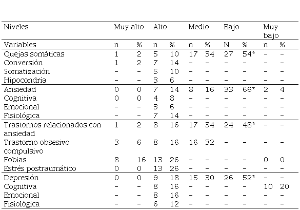 * Mayor porcentaje de participantes en cada variable.Aun así, es importante recalcar que en quejas somáticas hay un 34 % con nivel medio de puntaje (personas con alguna preocupación por su salud y/o con dolencias o enfermedades), y en especial un 10 % de las mujeres participantes que tienen un nivel alto (preocupación significativa y deterioro notable en su salud). En cuanto a la ansiedad, el 16 % presentó un nivel medio (cierto nivel de estrés de cualquier tipo) y el 14 %, un nivel alto (nivel significativo de tensión y estrés). En la variable trastornos relacionados con la ansiedad hay un 34 % con nivel medio de puntaje (presentan algunos miedos específicos y poca confianza en sí mismas y en sus posibilidades), y un 16 % de las mujeres participantes que tienen un nivel alto, sufren de limitaciones en la vida cotidiana relacionadas con miedos específicos y la presencia de inseguridad en situaciones sociales. En depresión, 30 % se ubica en el nivel medio (caracteriza a personas sensibles, pesimistas, que se sienten infelices una parte del tiempo) y el 18 %, en el nivel alto (infelicidad notable y disforia).