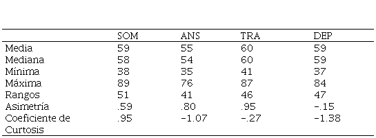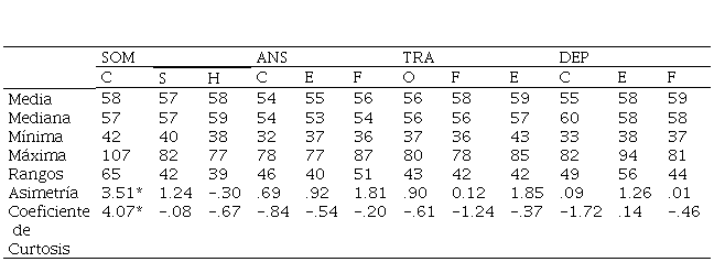 Del análisis estadístico descriptivo se recalca que las cualidades del grupo estudiado condicionan el tipo de análisis inferencial empleado: tanto los valores obtenidos en la asimetría, como en el coeficiente de Curtosis muestran que, en la variable quejas somáticas: conversión, los datos obtenidos no siguen una distribución paramétrica normal (Tablas 2 y 3).