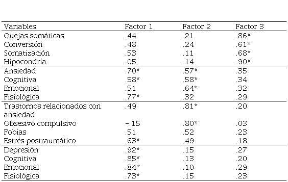 En la siguiente etapa del procesamiento de los datos, se utilizó el análisis factorial con el propósito de determinar las relaciones entre las variables de las subescalas de quejas somáticas, ansiedad, trastornos relacionados con ansiedad y depresión del grupo, a través de la identificación de tres factores presentados en la Tabla 4. El factor 1 incluye las variables ansiedad, ansiedad cognitiva, ansiedad fisiológica, estrés postraumático, depresión, depresión cognitiva, depresión emocional y depresión fisiológica. En el factor 2 entran las variables ansiedad, ansiedad emocional, ansiedad cognitiva, trastornos relacionados con ansiedad, y obsesivo-compulsivo. El factor 3 abarca las variables quejas somáticas conversión, somatización e hipocondría.