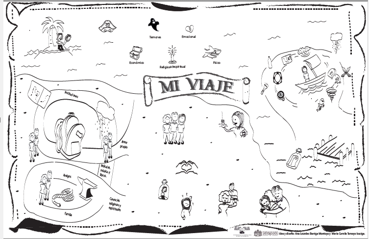 Se empleó una entrevista semiestructurada que permitió profundizar en las experiencias personales de cada participante de manera flexible y adaptativa al relato (Vargas Jiménez, 2012). Además, se utilizó una técnica interactiva conocida como línea de tiempo que se denominó Mi viaje (ver figura 1), la cual es una propuesta original del equipo investigador que permitió, tanto a los hijos/as como a los padres/cuidadores de manera individual, plasmar una narración visual a través de dibujos, colores y frases. Así se abordaron los diferentes momentos por los que puede atravesar una familia durante el proceso de revelación y aceptación de la orientación sexual de un hijo/a. En este sentido, facilitaba explorar y profundizar los significados que emergían en sus narrativas verbales (Ketelle, 2010). Cabe resaltar que ambos instrumentos fueron validados por seis jueces expertos y mediante dos pruebas piloto con familias que cumplían con los criterios de inclusión.