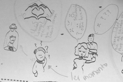 Mientras hablaban sobre las formas de revelación, los hijos e hijas interactuaron con la línea de tiempo y resaltaron imágenes que representaban a un joven al interior de una botella o con signos de interrogación alrededor de su cabeza (figura 2), lo que relacionaron con los temores, inseguridades, miedos y emociones negativas que la revelación había traído para ellos. Así, algunos manifestaron optar por una actitud de encerramiento y frustración, sentir que habían decepcionado a sus padres y cohibirse anticipándose a las posibles reacciones que ellos tendrían, tal y como lo represento Esteban (22 años, hijo de Teresa) en su línea de tiempo: