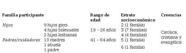 Las 15 familias, con un total de 30 participantes, estuvieron conformadas por diadas de padres-madres o cuidadores con sus hijos gays e hijas lesbianas y bisexuales. Las edades de hijos e hijas oscilaban entre los 19 y 26 años y la de padres-madres y cuidadores entre los 41 y 64 años. En cuanto al estrato socioeconómico de las familias, una pertenecía al 2 –bajo–; siete al 3 –medio bajo–; cinco al 4 –medio– una al 5 –medio alto–, y una al 6 –alto. La mayoría de los padres y madres dijeron ser católicos, cristianos o evangélicos (ver tabla 1).