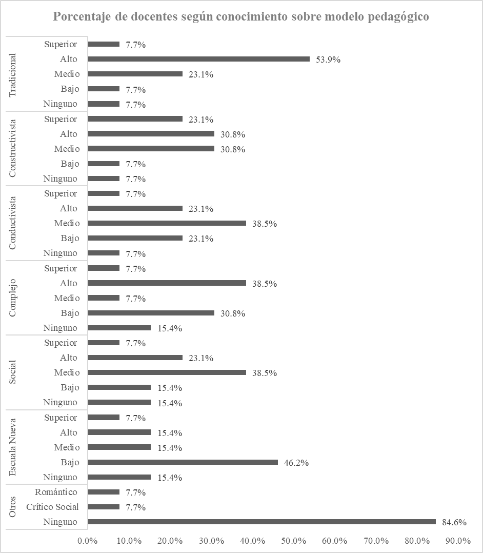 Los resultados de la encuesta que fue estructurada con preguntas puntuales respecto a los modelos pedagógicos: tradicional, constructivista, conductivista, complejo, social, escuela nueva y otros, los docentes mostraron que el conocimiento del modelo pedagógico tradicional es conocido en un alto grado con un 53.9 %, en relación con el modelo constructivista y al modelo complejo los cuales son conocidos en un grado alto con un 30.8 % y el 38.5 % respectivamente. Por otra parte, los modelos pedagógicos conductivista y social son conocidos en un grado medio con un 38.5 %, finalmente el modelo escuela nueva es conocido por los docentes en un grado bajo correspondiente al 46.2 %. No obstante, en el ítem Otros, el 84.6 % de los docentes, expresaron no conocer ninguno otro modelo pedagógico diferente a los expuestos anteriormente.