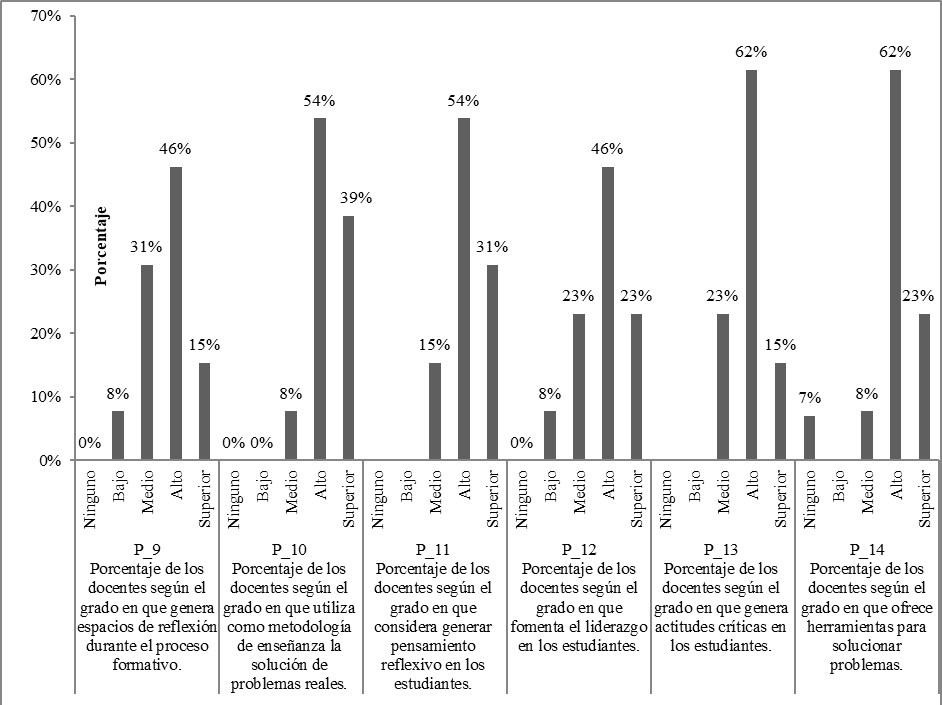 El desarrollo de la clase de taller, en la P_9, los estudiantes expresan que mayoría de docentes generan espacios de reflexión sobre el proceso formativo: 46 %; en P_10 y P_11, concuerdan que los docentes utilizan solución a problemas reales como estrategia de enseñanza y generan pensamiento reflexivo en los estudiantes con un 54 %. Asimismo, el 46% de los estudiantes en la P_12 coinciden en que los docentes fomentan el liderazgo en los estudiantes y finalmente en las P_13 y P_14, el 62 % de los estudiantes respondieron que los docentes generan actitudes críticas en ellos y ofrecen herramientas para solucionar problemas.