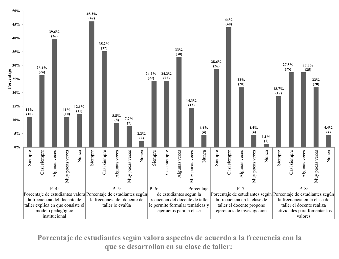 Las preguntas (P_4 hasta la P_8), se centraron en valorar la frecuencia con la que los docentes desarrollan algunos procesos en las clases de taller como: la reincidencia con la que explican en qué consiste el modelo pedagógico institucional, a lo que responden con un 39.6 % que “algunas veces”, con 26.4 %, “casi siempre” y un porcentaje pequeño del 12.1 % afirma que “nunca”. Por otra parte, los estudiantes responden con un 46.2 % que “siempre” son evaluados por los docentes, en un 35.2 %, coinciden en que “algunas veces”, y tan solo el 2.2 % afirma que no son evaluados con frecuencia. Otro aspecto de la encuesta fue conocer con qué frecuencia el docente de taller les permite a los estudiantes formular temáticas y ejercicios para la clase, allí respondieron con un 33 % que “casi siempre” cuentan con esos espacios. Asimismo, el 44 % de los estudiantes coincidieron al afirmar que los docentes proponen ejercicios de investigación y, finalmente, que el docente realiza “casi siempre” actividades para fomentar los valores respondieron en un 27.5 %. De esto se desprende que algunos docentes explican el modelo pedagógico, pero la mayoría lo tiene en cuenta para los procesos de evaluación a través de temáticas y ejercicios de investigación, lo que quiere decir que importa más el desarrollo y puesta en práctica que su socialización.