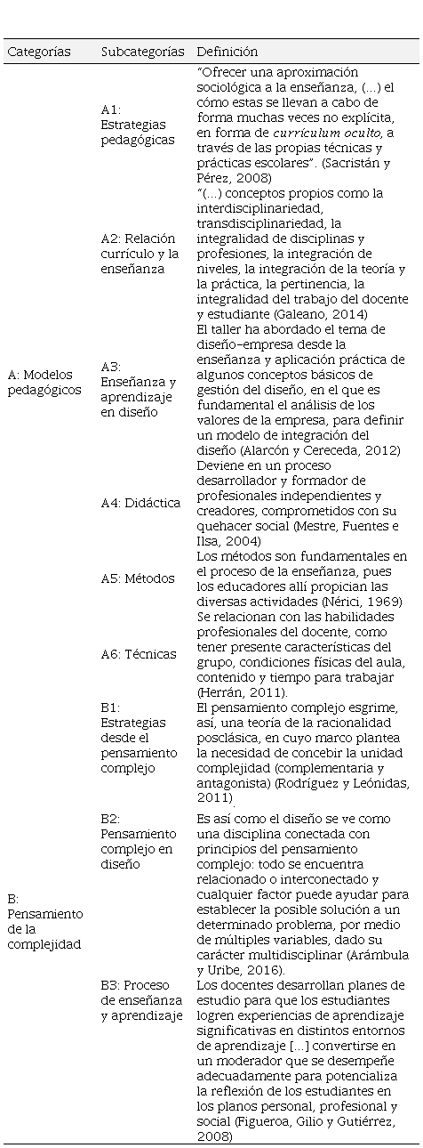 Por lo tanto, la información adquirida de los instrumentos aplicados fue sistematizada, comparada y analizada (Figura 1). En un primer momento se abordó a los docentes que orientaban los talleres de diseño con un cuestionario, el cual se dividió en dos categorías de análisis: por un lado, los aspectos y contenidos conceptuales del modelo pedagógico, y el por el otro, los aspectos del pensamiento complejo y estrategias pedagógicas en DG.