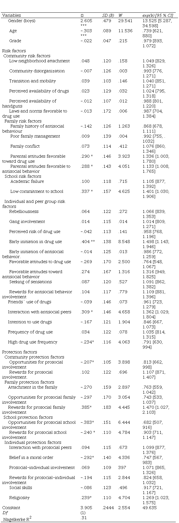 A logistic regression model was estimated to test the factors with the most significant effect on recidivism, and gender and age were included as control variables. The predictors were risk and protective factors, and the dependent variable was recidivism. Non-recidivist adolescents were identified with a score of zero (0), the recidivist adolescents whith a score of one (1). In the sample, 32 % met the conditions for consideration as a recidivist. The variables were included simultaneously, and the model was significant (X2 = 161.3 [df= 43] . < .001, and correctly classified 74.6 % of the cases (Nagelkerke R. .31).