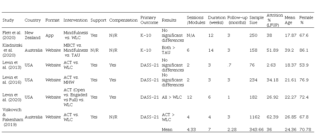 The database search yielded 1 408 results, with no duplicate studies found as only Scopus was used for the search; all the results were written in English. The titles and abstracts of studies found were screened for full-text review, which excluded 1 387 (Figure 1). Among the 21 studies kept for full-text review, 15 were excluded for diverse reasons: five did not feature a third-wave OPI (Anstiss & Davies, 2015; Farrer et al., 2019; Simpson et al., 2015; Weisel et al., 2018; Weisel et al., 2019), three were actually study protocols and did not present outcome data (González-Robles et al., 2015; Rahmadiana et al., 2019; Witlox et al., 2018), seven of them did not feature a valid control comparison as their experimental designs were pre-post or open trial (Economides et al., 2019; Finlay-Jones et al., 2016; Firestone et al., 2019; Kladnitski et al., 2018; Krüsche et al., 2013; Levin et al., 2017; Silva-Almodovar et al., 2018). Also, two studies came to the author’s attention after the search, but neither was included due to exclusion criteria (Haeger et al., 2020; Riva et al., 2020). Finally, six studies were included for data analysis (Flett et al., 2020; Kladnitski et al., 2020; Levin et al., 2013; Levin et al., 2016; Levin et al., 2020;Viskovich & Pakenham, 2019) their main characteristics are summarized in Table 1. Nine separate third-wave OPI vs. control comparisons were identified within the included studies and included as individual interventions for data analysis.