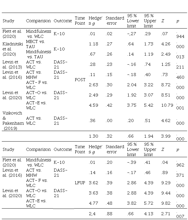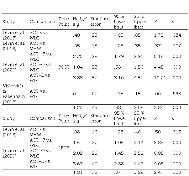Controlled between-group effect size biases corrected for small samples (Hedges’s .; Hedges, 1981) were computed for all the outcome and process measures at pretreatment, posttreatment, and the last follow-up. The first or corresponding author of the study was requested to provide the necessary raw data to compute . in case the article did not contain them. Valid and reliable measures of psychological distress or emotional symptomatology such as the Depression Anxiety and Stress Scales (DASS-21; Antony et al., 1998) and the Kessler Psychological Distress Scale (K-10; Kessler et al., 2002) were considered as general distress outcomes. On the other hand, when present in the study, the Acceptance and Action Questionnaire (AAQ-II; Bond et al., 2011) and the Avoidance and Fusion Questionnaire for Youth (AFQ-Y; Greco et al., 2008) were considered psychological flexibility outcomes. Effect sizes were computed for both variables so that positive effects represent better results for the third-wave interventions and negative effects represent better results for the control conditions. Hedges’s . effect sizes were interpreted using Sawilowsky’s (2009) update on Cohen’s (1988) rule-of-thumb considering very small (.1), small (.2), medium (.5), large (.8), very large (1.2), and huge (2.0).