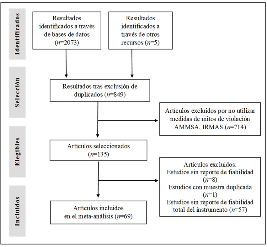 El proceso de selección de los estudios primarios consideró cuatro etapas. Primero, se compilaron todos los artículos recolectados en las bases de datos antes señaladas (n = 2078), publicados entre los años 2005 y julio del 2020. Segundo, se leyeron los títulos y se eliminaron todos los artículos duplicados (n = 849). Tercero, se procedió a la lectura de títulos, resúmenes, palabras claves e instrumentos utilizados en cada artículo y se eliminaron los artículos que no cumplían con los criterios de inclusión; los que respondían a estudios realizados con metodologías cualitativas; los estudios teóricos, y los que utilizaron medidas de los mitos de violación distintas a las escalas IRMAS o AMMSA (n = 135). Cuarto, se llevó a cabo la lectura de los textos en los que se eliminaron los artículos que consideraron muestras utilizadas en otro estudio y que no reportaron el alfa de Cronbach del instrumento completo. De este proceso, se obtuvo un total de 69 artículos que cumplían con los criterios de selección (Figura 1).