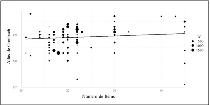 La Figura 2 muestra un gráfico de burbujas que representa la relación entre el número de ítems y las alfas de Cronbach sin transformar. Cada burbuja representa a los 98 estudios y su superficie representa el tamaño de la muestra. La recta de regresión se estimó mediante la media condicionada y el método de mínimos cuadrados (Chang, 2018). Se puede observar que las alfas de Cronbach aumentan su valor en la medida que se incrementa el número de ítems de las medidas de aceptación de mitos de violación.