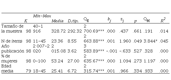 En la Tabla 1 se describen los estadísticos de las variables continuas y los resultados de las metarregresiones de cada variable moderadora. El número de ítems es la única variable que muestra asociación estadística significativa con el alfa de los estudios (. = .049), con un porcentaje de varianza explicada, del 4.5 % (R. = .045). Este resultado era esperado, debido a la conocida relación entre la fiabilidad y la longitud del test. Para las otras variables moderadoras continuas no se observaron relación estadística significativa.