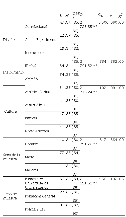 Nota: K = número de estudios. M = media de los α ponderados. IC95 % = Intervalo de confianza. QE = estadístico de contraste de la especificación del modelo. QM = estadístico de contraste del moderador. p = nivel de significancia. R2 = proporción de la varianza explicada por la variable moderadora. *** p < .001.