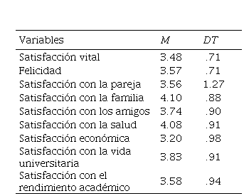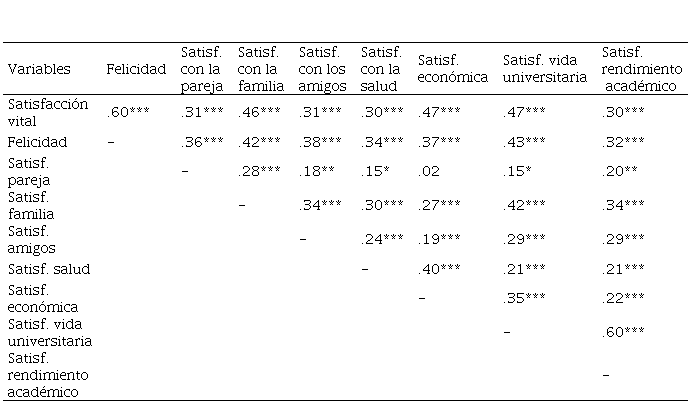 En la Tabla 1 se presentan los estadísticos descriptivos. Como se puede apreciar, los dominios con mayor satisfacción, en su orden, son: la familia, la salud y la vida universitaria. El dominio económico es, por el contrario, el que menor satisfacción genera en los participantes. La media de la felicidad, por su parte, es ligeramente superior a la media de la satisfacción vital.