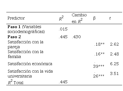 En la Tabla 2 se pueden apreciar las correlaciones . de Pearson. Tanto la satisfacción vital como la felicidad se relacionaron positiva y significativamente con todas las satisfacciones de dominios, y la correlación fue especialmente alta en el caso de la satisfacción vital global, y con respecto a la satisfacción con la vida universitaria, la economía y la familia. La felicidad también presentó una fuerte conexión con la satisfacción en los dominios de vida universitaria y familia.