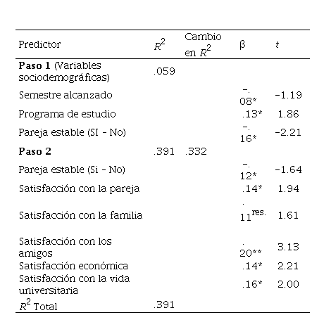 Con el fin de controlarlas y conocer su impacto sobre los componentes del bienestar, se introdujeron en el modelo 1 solo las variables sociodemográficas (género, jornada de estudios, semestre alcanzado, programa de estudios, ocupación laboral, pareja estable). En el modelo 2, se introdujeron, además de estas, las satisfacciones en los dominios de pareja, familia, amigos, salud, económico, vida universitaria y rendimiento académico. Previamente se verificó el cumplimiento de las condiciones y supuestos de aplicación, como la confirmación de independencia de residuos por el estadístico Durbin-Watson, la confirmación de normalidad de las gráficas de distribución de estos y el cumplimiento de los supuestos de linealidad y homocedasticidad. Finalmente se constató que no hubiese multicolinealidad a través de la tolerancia y la inflación de varianza. Dichas pruebas confirmaron la validez de las conclusiones del modelo.