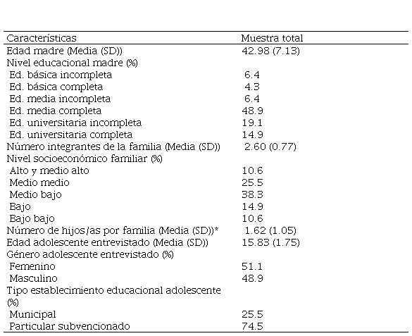 Respecto de las características sociodemográficas de los participantes presentes en tabla 1 se observó que las madres tenían en promedio 42.9 años de edad, con una desviación estándar de 7.1, y un 48.9 % de ellas había cursado su educación media completa. Por otro lado, los hijos adolescentes entrevistados tenían una edad promedio de 15.8 años, con una desviación estándar de 1.7. El 51.1 % de ellos definió su género como femenino y un 48.9 % como masculino, y un 74.5 % asistía a un colegio particular subvencionado por el estado de Chile. En torno al grupo familiar, es relevante indicar que el número promedio de integrantes por familia fue de 2.6, el número promedio de hijos por familia de 1.6 y, en mayor proporción, pertenecían al estrato socioeconómico medio bajo (38.3 %).
