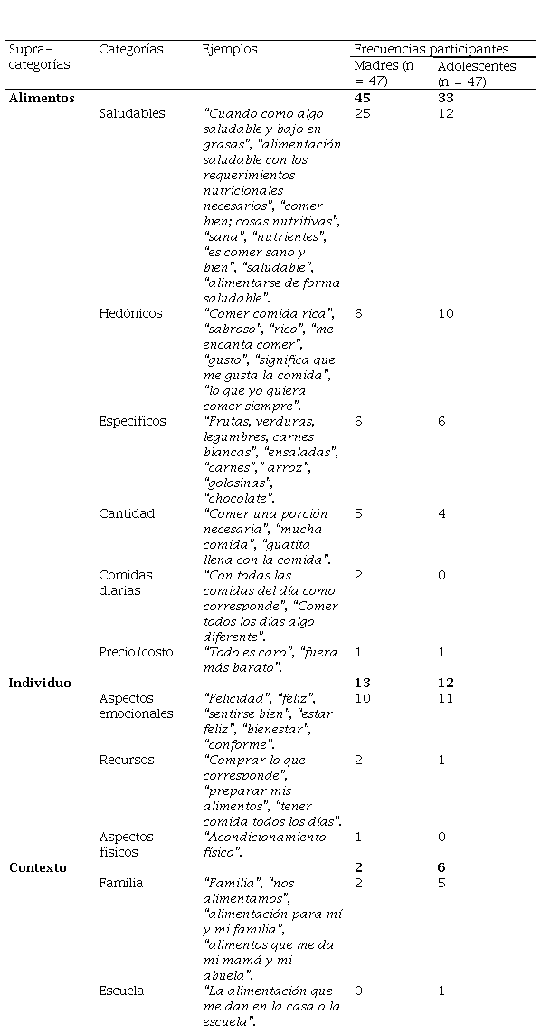 Con la finalidad de conocer cuáles eran las entidades semánticas de significado de madres e hijos adolescentes en torno a la satisfacción con la alimentación, las palabras y frases fueron agrupadas por conteo de frecuencia, en categorías y luego dispuestas según las supracategorías provenientes de la literatura: alimentación, individuo y contexto. Tal como es posible de visualizar en tabla 2, la supracategoría alimentos estuvo compuesta por las categorías: saludables, hedónicos, alimentos específicos, cantidad, comidas diarias y precio/costo. Por otro lado, la supracategoría individuo se conformó por las categorías: aspectos emocionales, recursos y aspectos físicos. Por último, la supracategoría contexto estuvo compuesta por las categorías familia y escuela.