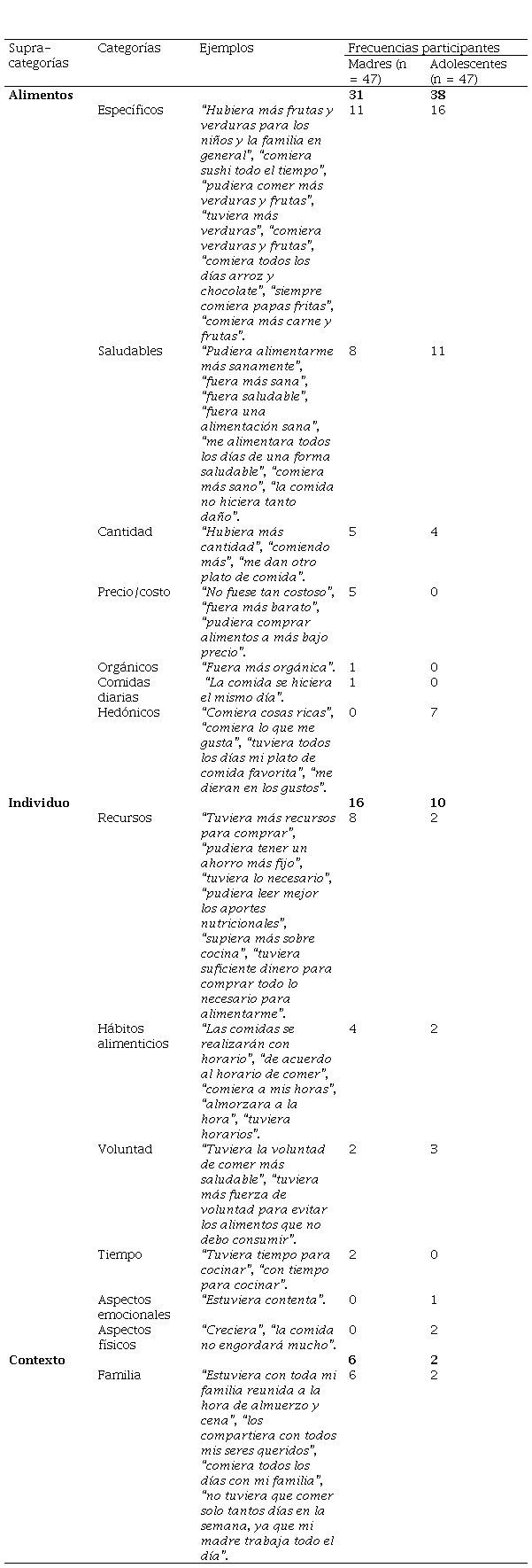 Con el propósito de identificar cuáles eran los aspectos que aumentarían la satisfacción con la alimentación en madres e hijos adolescentes, las palabras y frases fueron agrupadas por conteo de frecuencia, en categorías y, luego, dispuestas en las supracategorías provenientes de la literatura: alimentación, individuo y contexto, que están expuestas en tabla 3. La supracategoría alimentos se integró por las categorías: alimentos específicos, saludables, cantidad, precio/costo, orgánicos, comidas diarias y hedónicos. La supracategoría individuo se conformó por las categorías: recursos, hábitos alimenticios, voluntad, tiempo, aspectos emocionales y aspectos físicos. La supracategoría contexto se integró por la categoría: familia.