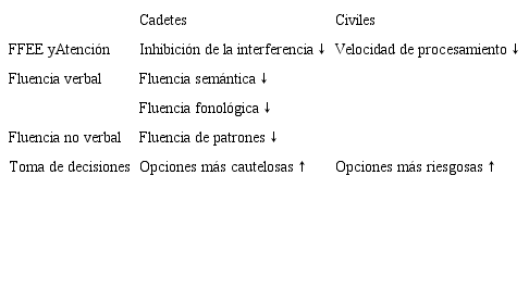 En la Tabla 6 se resumen los hallazgos de la comparación de cadetes y civiles.