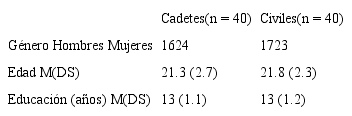 La muestra estuvo compuesta por 80 participantes (60 % mujeres), de los cuales 40 eran cadetes (67 % mujeres) de la Universidad de la Defensa Nacional, Argentina. Entre los cadetes, la media de edad fue de 21.7 años (DS = 2.3), con un mínimo de 19 y un máximo de 27 años. Por otra parte, los 40 participantes restantes (58 % mujeres) provenían de la población general de la Ciudad Autónoma de Buenos Aires, Argentina. La media de edad fue de 21.7 años (DS = 2.5), con un mínimo de 19 y un máximo de 27 años. Tanto la edad como el nivel educacional de los participantes (todos eran estudiantes terciarios) fue equivalente para homogeneizar ambos grupos de comparación. Los participantes fueron reclutados de forma voluntaria a través del completamiento de un formulario de consentimiento informado. Se siguieron los lineamientos éticos propuestos en la Declaración de Helsinki (2004), garantizando el anonimato y confidencialidad de los datos suministrados.