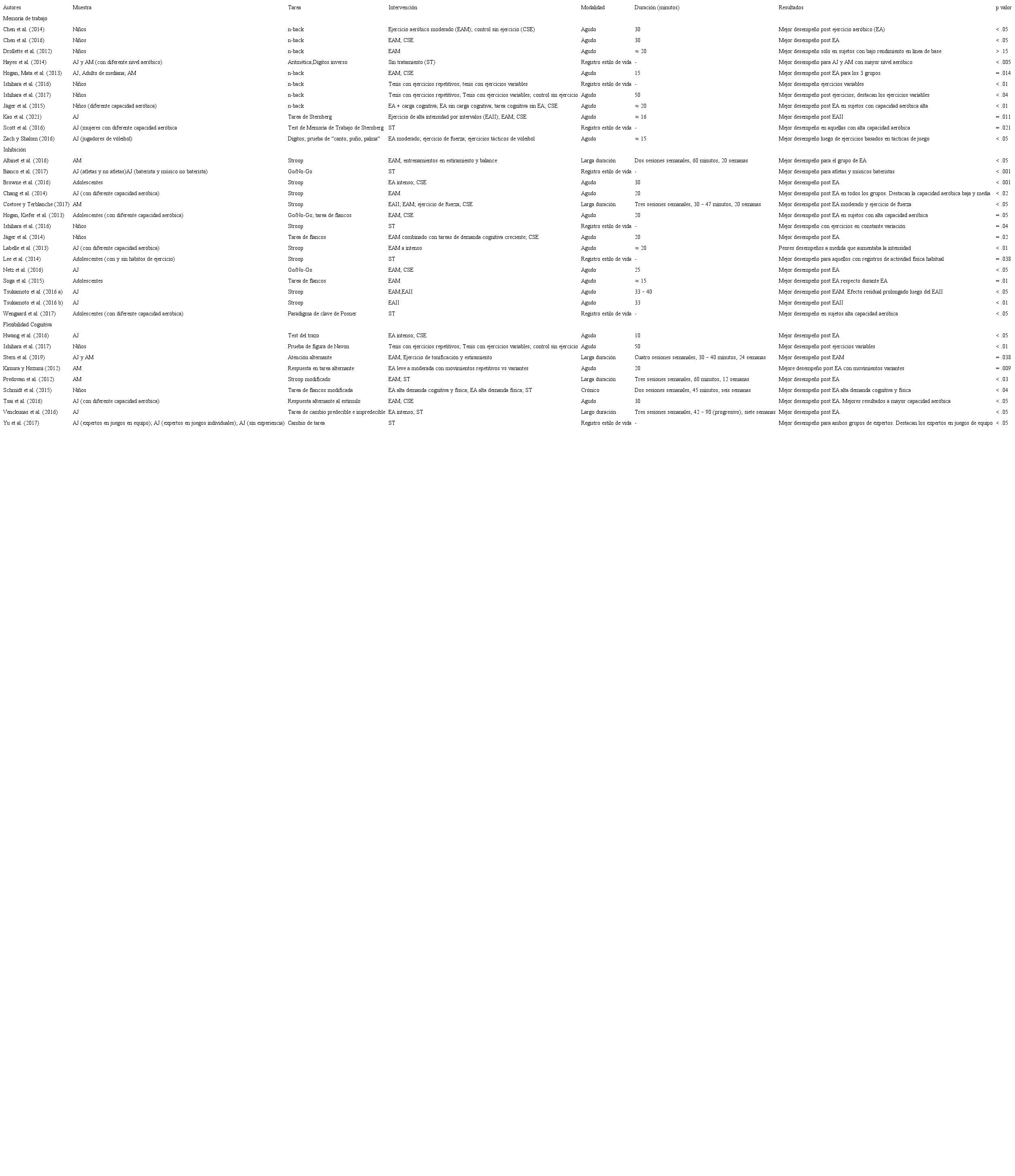 La Tabla 1 presenta los principales resultados. Los 33 artículos empíricos incluidos para la síntesis cualitativa se dividieron en: 1) memoria de trabajo; 2) inhibición, y 3) flexibilidad cognitiva. En cada apartado se encuentran diferentes poblaciones: a) niños de 6 a 12 años (n = 8); b) adolescentes de 13 a 18 años (n = 5); c) adultos jóvenes de 18 a 60 años (n = 14), y d) adultos mayores (> 60 años; n = 4). Dos artículos realizan comparaciones entre poblaciones (Hayes et al., 2014; Hogan, Mata et al., 2013).