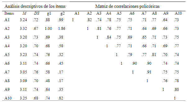 En la Tabla 1 se aprecia que la puntuación promedio de los 10 ítems varía entre 3.05 (DS = .76) a 3.32 (DS = .67). Asimismo, la asimetría y curtosis evidencian que todos los ítems presentan valores adecuados (As < ±2; Ku < ±7), según los criterios de Finney y DiStefano (2006).