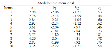 Para la TRI se empleó un Modelo de Respuesta Graduada (GRM; Samejima, 1997), específicamente una extensión del Modelo logístico de dos parámetros (2-PLM) para ítems politómicos ordenados (Hambleton et al., 2010). Para cada ítem se estimaron dos tipos de parámetros: a) discriminación y b) dificultad. El parámetro de discriminación determina la pendiente en la que cambian las respuestas a los ítems en función del nivel en el rasgo latente, mientras que los parámetros de dificultad del ítem determinan qué cantidad del rasgo latente requiere el ítem para ser contestado.