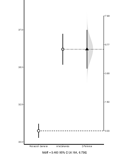 De modo a hacer una comparación estimativa de participantes de ArteSanando con la población general a partir de los datos de Luna et al. (2020), se realizó un análisis de estimación de la diferencia de medias independientes (Calin-Jageman y Cumming, 2019). Esta comparación indica que el grupo que participó en ArteSanando puntuó significativamente más alto en bienestar psicológico que la población general de adolescentes, t(308) = 8.23, p < .001. Además, la diferencia de 5.46 puntos entre ambos grupos es grande y se mantiene al tener en cuenta el intervalo de confianza; para un intervalo de confianza de 95 %, se estima que la diferencia menor podría ser de 4.164 puntos y la mayor de 6.756 puntos. La diferencia se observa en los siguientes gráficos.Figura 1 y Figura 2;Tabla 1 y Tabla 2