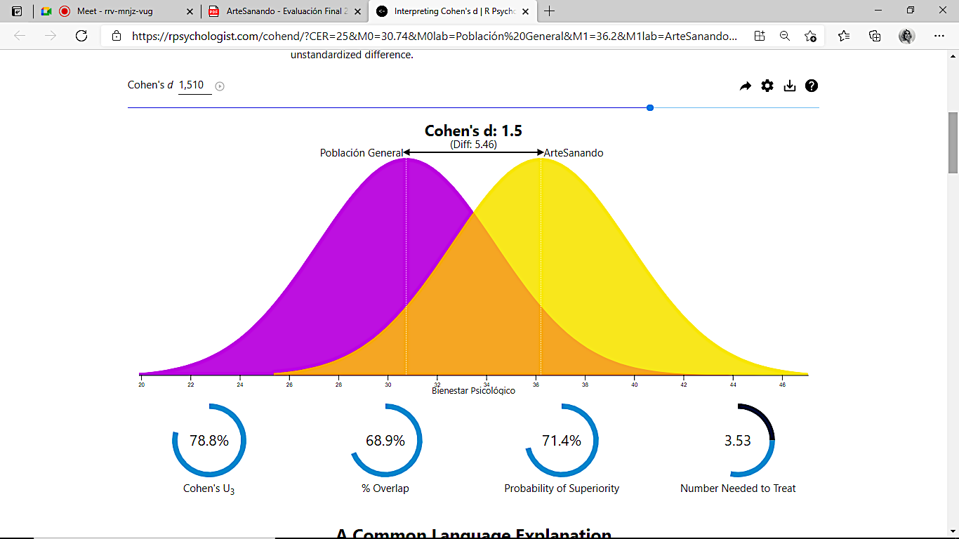El tamaño del efecto (d = 1.5) es alto (Cohen, 1988). El 78.8 % de los adolescentes que participaron de ArteSanando puntúa por encima de la media del grupo de la población general (Luna et al., 2020); el 68.9 % de ambos grupos se superponen. Hay un 71.4 % de probabilidad de que una persona elegida al azar del grupo de ArteSanando, presente mayor bienestar psicológico que una persona elegida al azar del grupo de población general, al seguir la interpretación de Magnusson (2022).