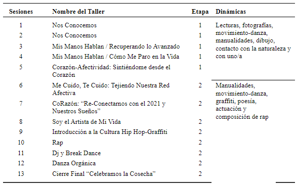 Thirteen workshops were conducted in two stages, covering a total of 4 months. The first stage took place between October and December 2020, and the second between January and February 2021, before starting the school year. Artistic dynamics of the first stage (1st-5th workshops) consisted of readings, photographs, movement-dance, crafts, drawing, contact with nature and with oneself. Dynamics of the second stage (6th-13th workshops) included handicrafts, movement and dance, graffiti, poetry, acting and rap composition. Meetings were synchronous, with asynchronous support.