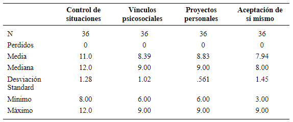 The levels of Situation Control (M = 11.0, SD = 1.28), Self-Acceptance (M = 7.94, SD = 9.00) and Psychosocial Relationships (M = 8.39, SD = 9.00) are moderate. The Personal Projects factor stands out (M = 8.83, SD = 9.00) reaching a high level. In participant stories, a marked increase in subjective well-being is evidenced, along with development and consolidation of the sense of belongingness, coping skills, and artistic expression.