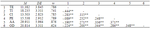 En laTabla 7 se expone la validez concurrente y divergente de las dimensiones de la ITIS. Para ello, se correlacionaron los puntajes de la TE y TI con los puntajes de la Escala de Grit-S (Consistencia de interés y Perseverancia en el esfuerzo), la Escala de Autoeficacia Académica y la Escala LOT-R, todas ellas adaptadas en una muestra de universitarios limeños. Además, se reportaron las medidas de fiabilidad que muestran que todas tienen los valores adecuados. Respecto a la TE, sus puntajes correlacionaron negativa y significativamente con la CI, la AA y el OD. Mientras, la TI correlacionó positiva y significativamente con la perseverancia en el esfuerzo (PE), AA y OD, la magnitud de estas asociaciones es pequeña.Tabla 7