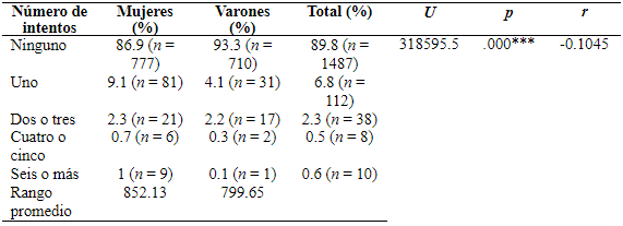 Como se observa en la Tabla 1, la mayoría de los participantes no informó haber tenido un intento de suicidio, siendo progresivamente menor el porcentaje de participantes que reportó un intento, entre dos y tres intentos, entre cuatro y cinco y seis o más intentos. Las mujeres reportaron un rango promedio significativamente mayor de intentos de suicidio que los hombres. Por otra parte, el 16.4 % (n = 271) de los participantes reportó haber pensado seriamente en la posibilidad de suicidarse en los últimos doce meses, porcentaje que entre las mujeres fue de 19.1 % (n = 171) y entre los hombres de 13.2 % (n = 100), diferencia que fue estadísticamente significativa: χ² (1, N = 1653) = 10.471, p = .001, OR = 1.554, IC 95 %: 1.188 - 2.033.