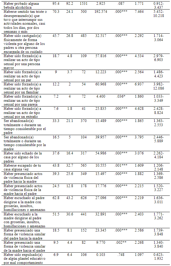 Finalmente, como se observa en la Tabla 3, un porcentaje significativamente mayor de los participantes que pensaron en un plan suicida, informó haberse sentido tan triste o desesperanzado(a) que tuvo que interrumpir sus actividades normales, casi todos los días, por dos semanas o más; haber sido castigado(a) físicamente de forma violenta por alguno de los padres u otro cuidador; haber sido forzado(a) a realizar un acto de tipo sexual por una persona mayor, un par, un familiar, una pareja o un extraño; haber sido abandonado(a) totalmente o durante un tiempo considerable por el padre y por la madre; haber sido echado de la casa por alguno de los padres; haberse escapado de la casa, y haber presenciado actos de violencia física, verbal o de otros tipos del padre hacia la madre y de esta última hacia el padre.