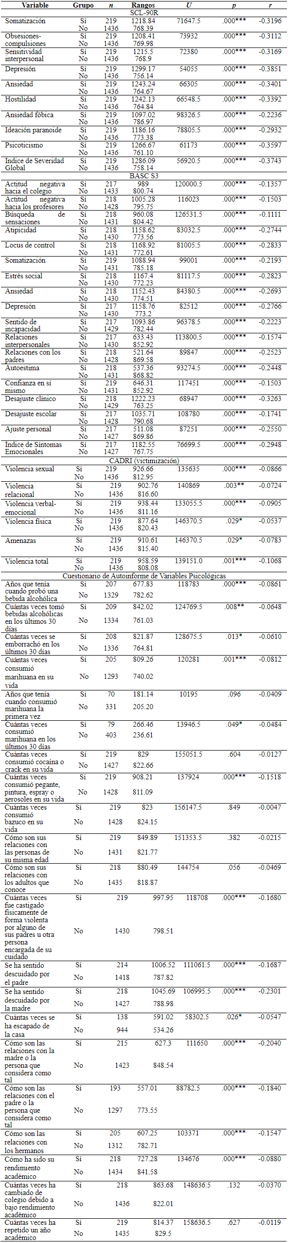 Como se observa en la Tabla 2, los participantes que pensaron en un plan suicida en los últimos doce meses, presentaron un rango de puntuaciones significativamente más altas en todas las escalas de la SCL-90R (González de Rivera et al., 1989), con tamaños del efecto moderados en su mayoría, así como en las escalas y los índices de desajuste clínico y escolar del BASC-S3 (González et al., 2004), evidenciando un rango de puntuaciones significativamente más bajas en las escalas y el índice de ajuste personal de dicho instrumento, comparados con los participantes que no pensaron en dicho plan, aunque los tamaños del efecto obtenidos con este instrumento fueron pequeños, en su mayoría. Asimismo, informaron en un rango significativamente mayor, haber recibido conductas de violencia sexual, relacional, verbal-emocional, física, amenazas y a nivel general, por parte de su pareja, en el CADRI (Fernández-Fuertes et al., 2006), empero con tamaños del efecto pequeños.