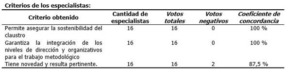 En la validación de la propuesta realizada según el criterio de especialistas existió consenso en su pertinencia, novedad, viabilidad y la posibilidad que ofrece de integración de los niveles de dirección y organizativos para el trabajo metodológico.