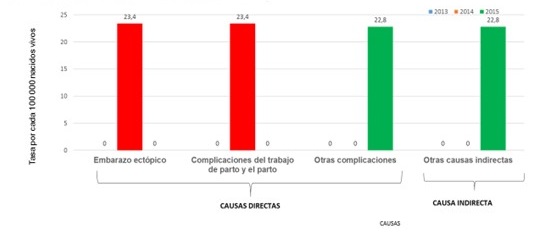 En el año 2013 no hubo muertes maternas. En 2014 hubo 2 fallecidas (tasa de 23,4 por 100 000 nacidos vivos) por causas directas, respectivamente; en 2015 hubo 2 fallecidas más, con una tasa inferior a la del año anterior, de 22,8 por cada 100 000 nacidos vivos, por causas directas e indirectas, respectivamente. (Gráfico 1).