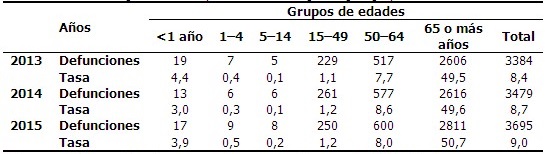 Del trienio estudiado, el año 2015 manifestó un incremento de la mortalidad general de un 3,4 % respecto al año anterior. El grupo de edad de 65 años y más presentó siempre la mayor tasa de defunción respecto al resto de los grupos etarios, con 50,7 por 1000 habitantes en el año 2015, como valor más alto. Le siguió el grupo de 50-64 años, y luego los menores de un año, con tasa de 4,4 por cada 1000 nacidos vivos en 2013. (Tabla 1).